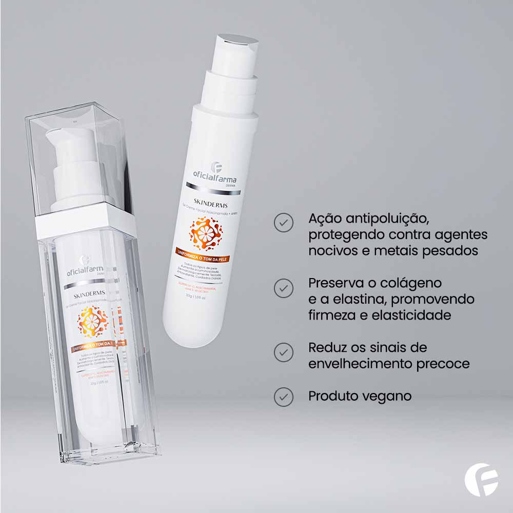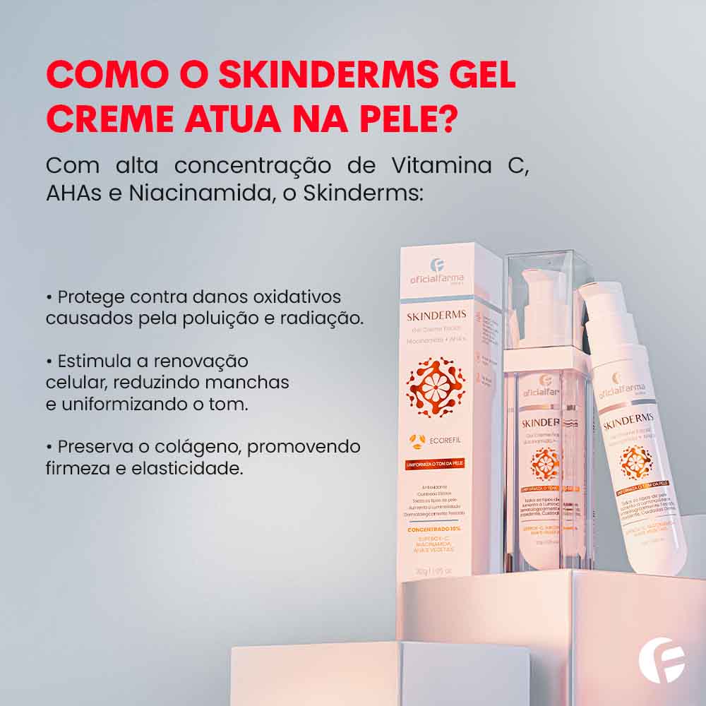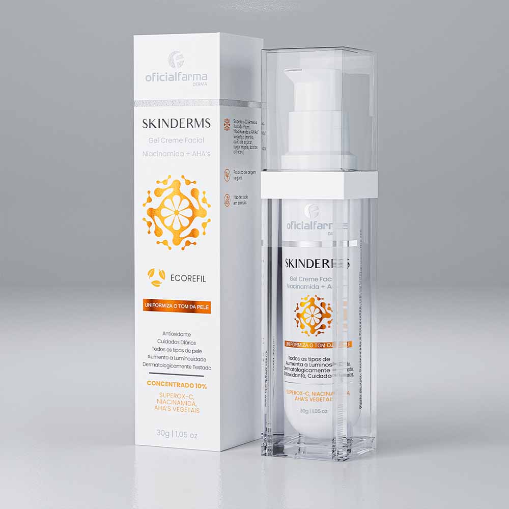 Formulado para combater os sinais de envelhecimento e proteger a pele das agressões urbanas, o Skinderms Gel Creme combina a poderosa ação antioxidante da Vitamina C com Niacinamida (B3) e ácidos vegetais (AHAs). Uma solução completa que preserva o colágeno, reduz o estresse oxidativo e uniformiza o tom da pele.